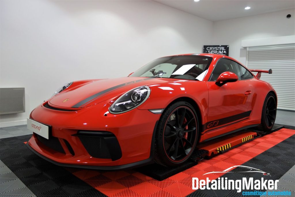 Afin de faciliter les entretiens, le reste de la carrosserie de cette splendide Porsche GT3 sera traité par une protection céramique Gtechniq. Centre officiel et accrédité Gtechniq, nous appliquons ce type de traitement céramique pour protéger efficacement votre véhicule. Garantie pendant plusieurs années, le traitement céramique Gtechniq Crystal Serum Ultra agît comme un second vernis, plus dur que le vernis d’origine, tout en étant complètement hydrophobe. Ce traitement se pose sans pistolet et l’altère pas la peinture, il s’érode de façon progressive avec le temps sans laisser de traces ou de taches.