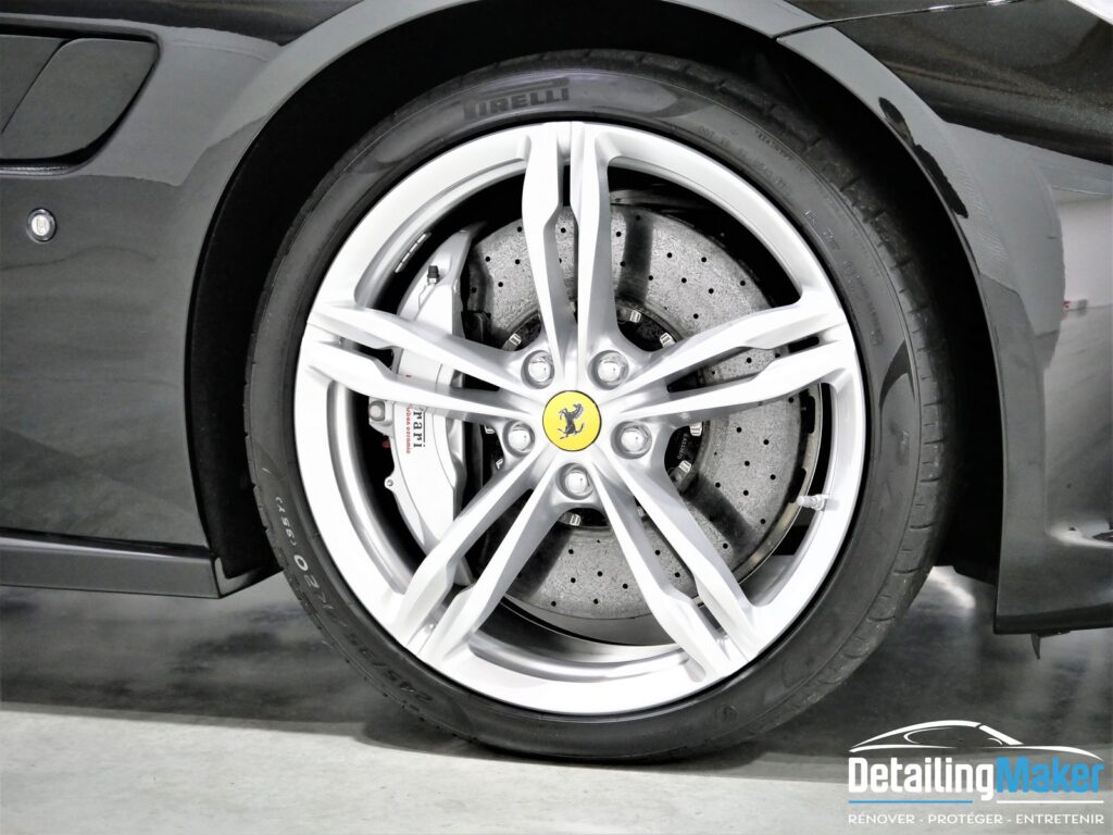 Après ce lavage méticuleux, nous déplaçons la Ferrari dans notre salle de préparation carrosserie, ou elle sera placée sur un pont de levage. Cette espace dédié dispose de différents éclairages permettant de mettre en évidence chaque défaut de carrosserie, de la petite bosse, à la petite micro rayure ou à une infime poussière dans le vernis (1 mm). Nous relevons ensuite différentes mesures micrométriques, afin de connaitre les différentes épaisseurs de vernis et effectuons un camouflage des parties sensibles : joints, plastiques, grilles, éléments noir mat, etc. Ensuite, à l’aide de machines dédiées de polissage et de lumières professionnelles, nous corrigeons l’ensemble des défauts. Cette correction sera effectuée en trois passes Medium, Fine et Extra-Fine permettant de révéler la brillance et la profondeur de la teinte Nero Daytona. La carrosserie est ensuite parfaitement dégraissée, afin que la protection se fixe durablement au vernis. Pour finir, la Ferrari GTC4Lusso rejoint une seconde fois notre salle de lavage intérieure pour retirer les poussières de polissage les plus petites coincées dans les ouvrants, les accès restreints, etc.