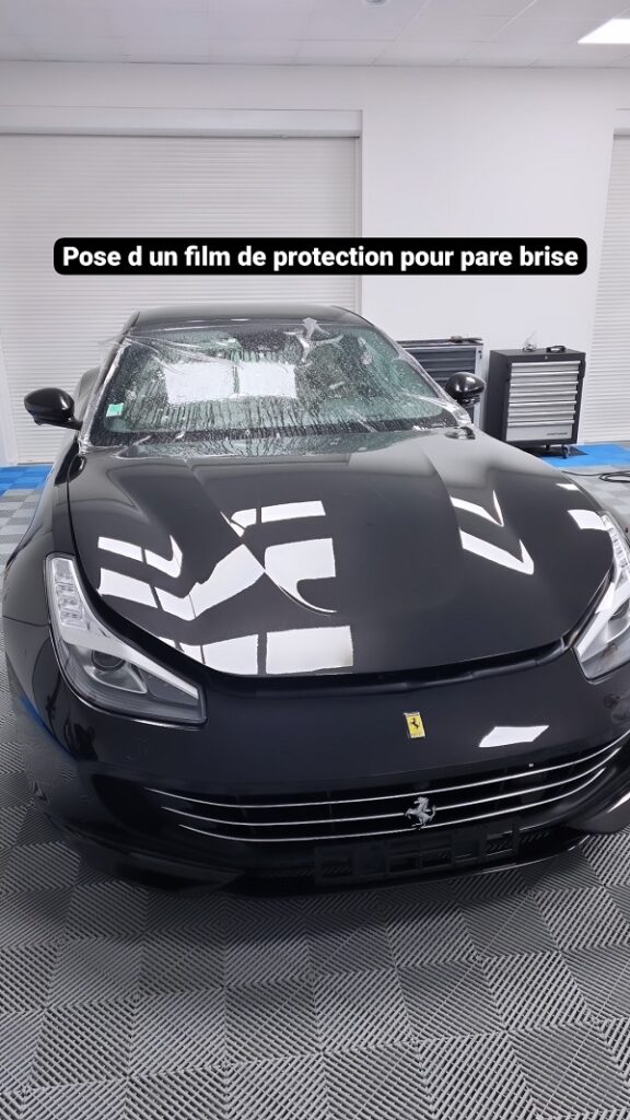 Après avoir protégée intégralement la carrosserie de cette splendide Ferrari GTC4Lusso, nous appliquons un film de protection sur le pare-brise. Cette protection spécifique pour le verre évitera les impacts et le changement prématuré ou répété du pare-brise.